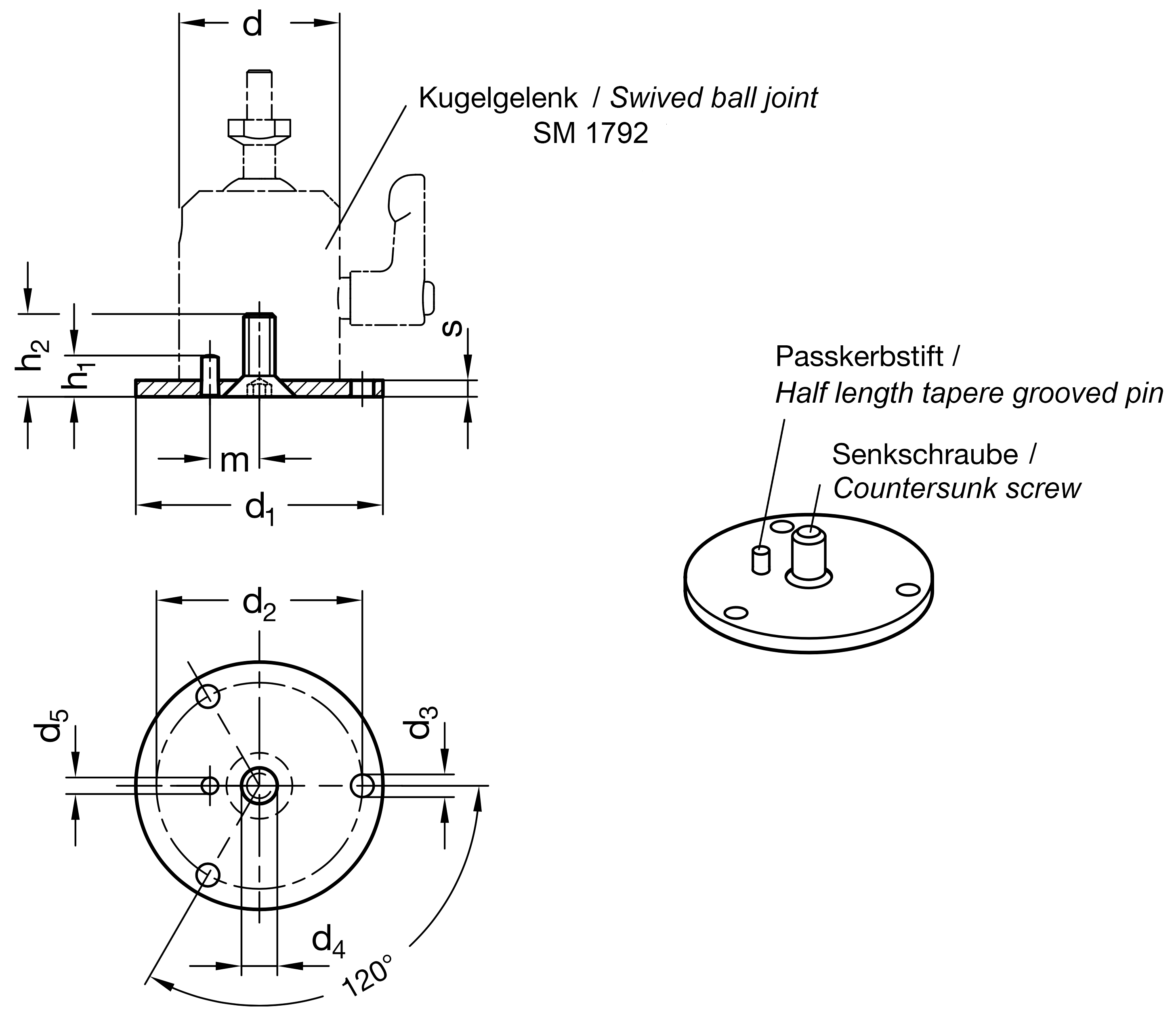 aus AluminiumKugel mit InnengewindeMaterial:Gehäuse: Aluminiumschwarz eloxiertBodenstück / Kugel: Aluminium blankverstellbarer Klemmhebel (Form A + C):Zink-Druckgusskunststoffbeschichtet, strukturmatt silber, RAL 9006 Schraubeneinsatz + Halteschraube: Edelstahl 1.4305Zylinderstift (Form B + D): Edelstahl 1.4301Form A: Klemmung mit verstellbarem Hebeld2/r1 für kleinere Gewinde d3/r2 für größere GewindeForm B: Klemmung mit Gewindestift mit Innensechskantd2/r1 für kleinere Gewinde d3/r2 für größere GewindeFür eine präzise und stufenlose Verstellung um den Kugeldrehpunkt innerhalb des Schwenkbereichs, z. B. beim Justieren von Scannern, Kameras, Beleuchtung oder Monitoren.Schon bei kleinen Anzugsdrehmomenten der Klemmschraube werden verhältnismäßig große Klemmkräfte an der Kugel erzeugt. Mit den Klemmhebeln (Form A und C) können diese leicht aufgebracht werden.Befestigung des Kugelgelenk per Innengewinde d5 von unten oder zusammen mit dem  Flansch SM 1793 über drei Durchgangsbohrungen von oben.Für dauerhaft gehaltene hohe Haltedrehmomente müssen die Kontaktflächen an der Kugel frei von Schmierstoffen gehalten werden. Ein Überschreiten der empfohlenen Anzugsdrehmomente steigert das Haltedrehmoment, kann aber zu erhöhtem Verschleiß der Klemmmechanik führen.RoHS-konform: ja