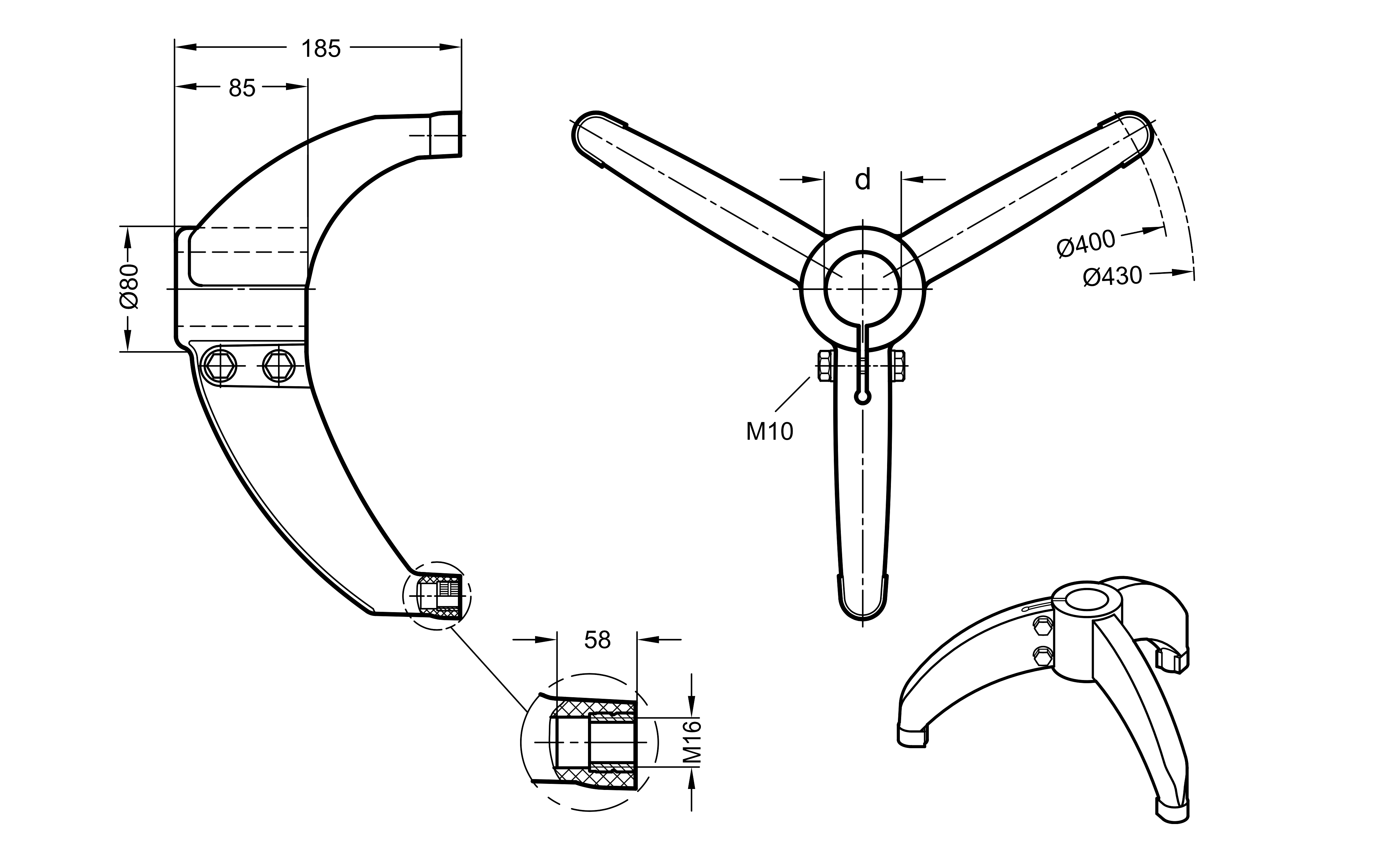 Für die Aufnahme von Stell- oder Gelenkfüßen (z. B. SM 3050) gibt es unterseitig Gewinde (M 16).