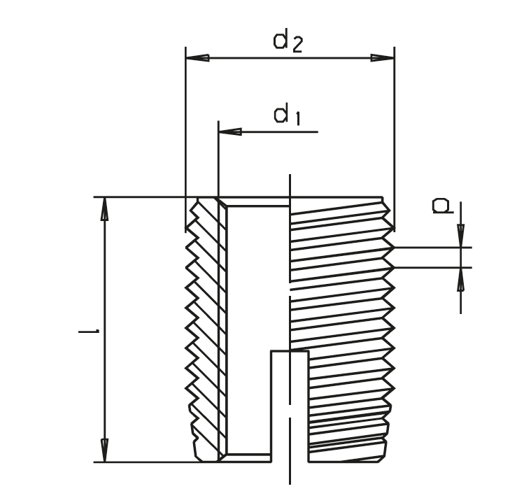 selbstschneidendmit drei Bohrungen, 1.4305 Material: NI: stainless steel 1.4305Innengewinde d1, nach ISO 6HAußengewinde d2, metrisch,Toleranzen nach Werknorm.Weitere Hinweise finden Sie auf dem Datenblatt SM 1291-50, Katalogseite 308. Vorbohrempfehlungen (Richtwerte)* Aufnahmeloch, abhängig vom Verarbeitungswerkstoff** Mindestlochtiefe (Sacklöcher): Muffenlänge zuzüglich 1 bis 3 mm. Gewindeeinsätze mit Innen- und Außengewinde- selbstschneidende Verbindungselemente zur Herstellung hochbelastbarer, verschleißfester, vibrationssicherer Schraubverbindungen in Werkstoffen mit geringer Scherfestigkeit,- mit 3 Schneidbohrungen, die das Einschrauben in härtere Materialien unterstützen,- geeignet zum Einbau in Aluminium und Aluminium-Legierungen, Magnesium-Legierunen, Duroplast, Thermoplast (ausgenommen gummiweiche Thermoplaste 100 Shore A).
