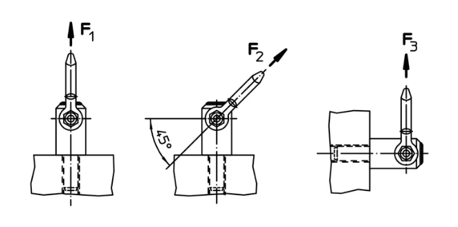 - Die Belastungswerte F1 / F2 / F3 (Tabelle Datenblatt) gelten für das Heben in einer Aufnahme aus Stahl.