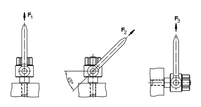- Die Belastungswerte F1 / F2 / F3 (Tabelle Datenblatt) gelten für das Heben in einer Aufnahme aus Stahl.