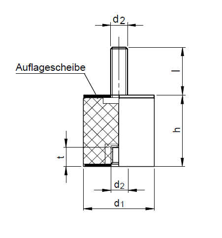 zylindrisch mit einer Gewindebuchse Material:Grundkörper: Gummi Naturkautschuk (NR)Härte: 55 ±5 shoreschwarz Auflagescheibe und Gewindebuchse: ST: Stahl, verzinktSST: Stahl, verzinkt (Sondergröße)NI: Edelstahl rostfrei Einsatz: als elastischer Endanschlag z. B. von Förderwagen, als Stellfuß.