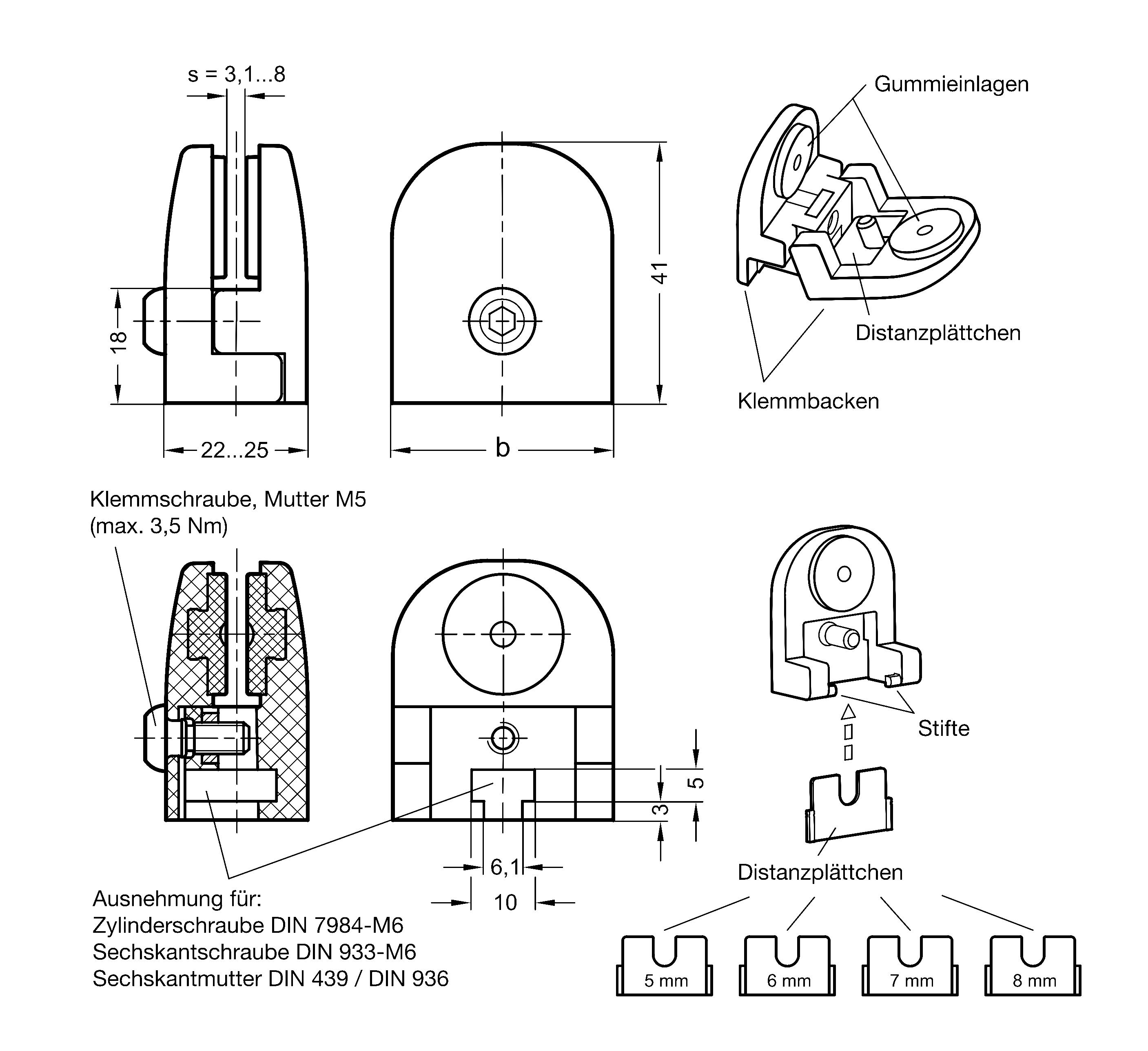 Mit der Hilfe von Distanzplättchen können Platten von 3 bis 8 mm Dicke geklemmt werden. Die 4 Distanzplättchen gehören zum Lieferumfang.