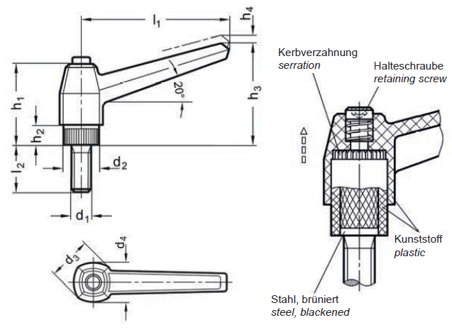 Durch Anheben (Ziehen) des Griffes wird die Kerbverzahnung frei und der Klemmhebel kann in die günstigste Spannposition geschwenkt werden.