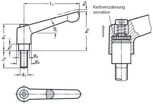 Durch Anheben (Ziehen) des Griffes wird die Kerbverzahnung frei und der Klemmhebel kann in die günstigste Spannposition geschwenkt werden.