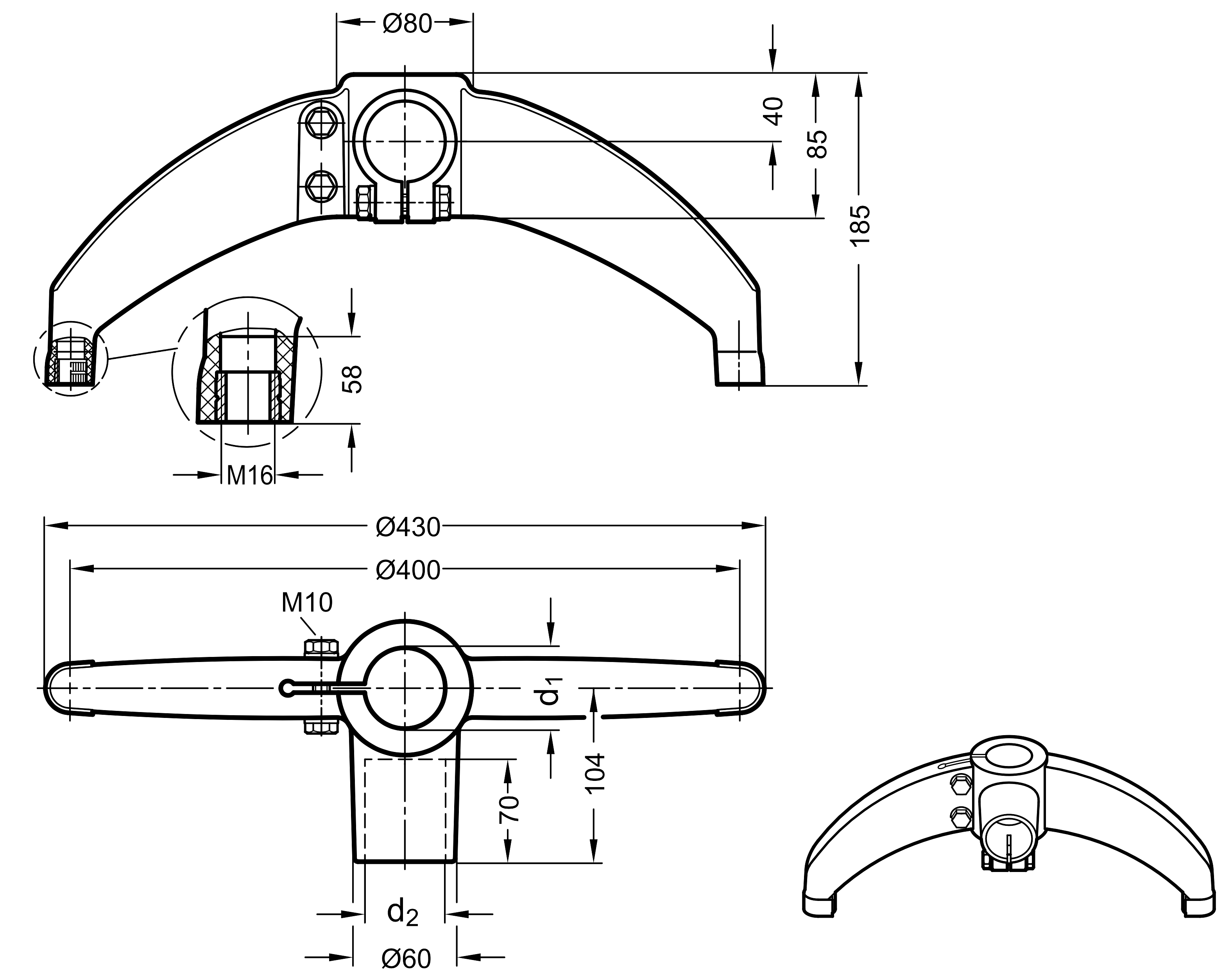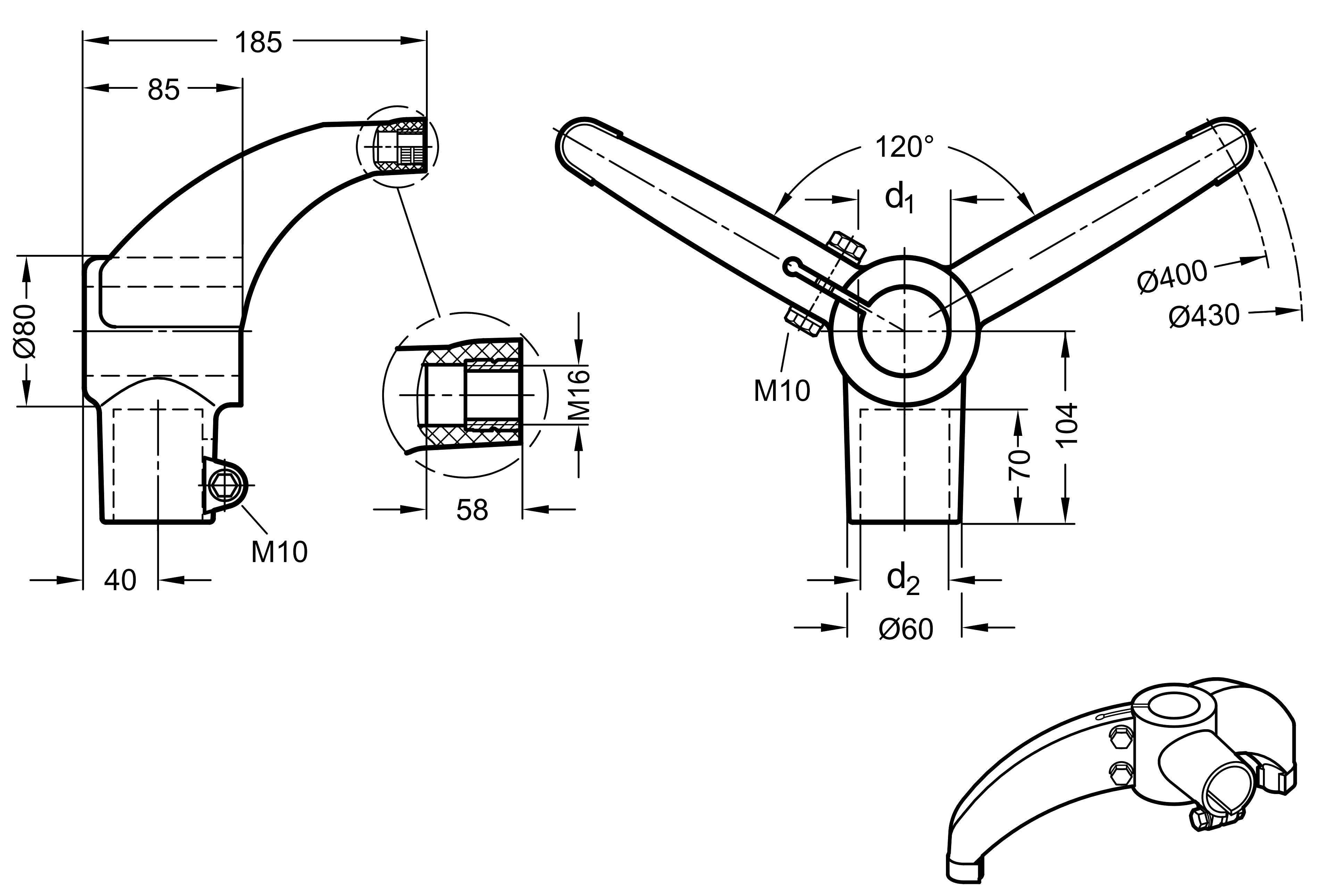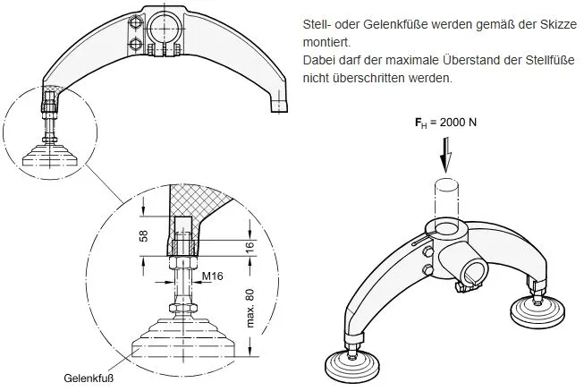 Für die Aufnahme von Stell- oder Gelenkfüßen (z. B. SM 3050) gibt es unterseitig Gewinde (M16).