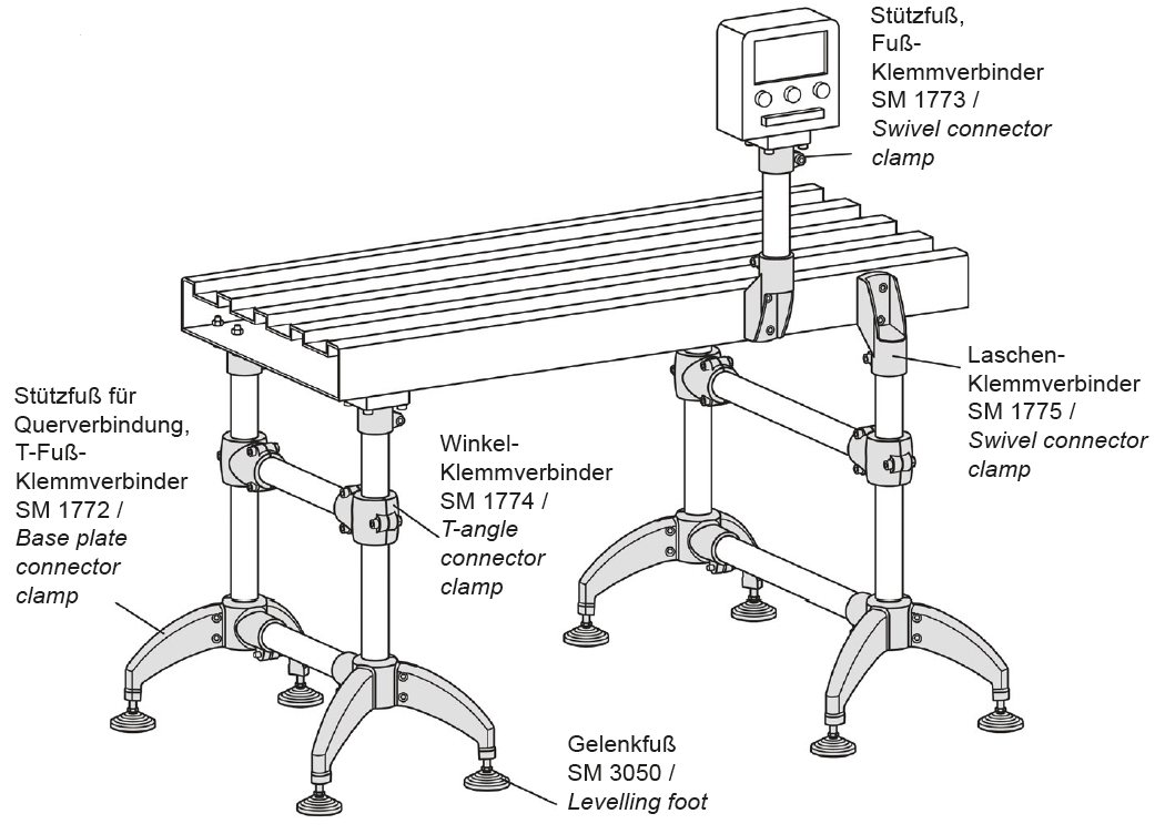 Stützfüße SM 1772 werden in Kombination mit z. B. Gewinderohren für die Konstruktion von Transportsystemen oder Arbeitstischen verwendet.