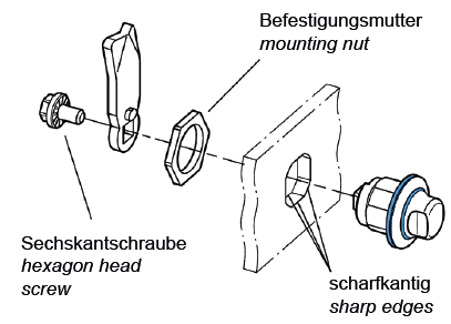 Das Verschlussgehäuse wird von vorne durch die Montagebohrung gesteckt und von der Rückseite mit der Befestigungsmutter verschraubt.