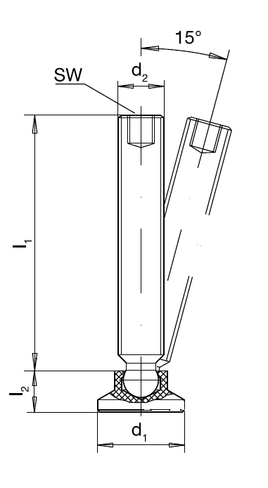 with bolt, ball element and rubber capas anti-slip deviceMaterial:Form BC: ball bearing with bolt: heat-treated steel, tempered, blackenedpad: heat-treated steel, tempered, blackenedForm BCDN: ball bearing with bolt: stainless steel 1.4305pad: Thermoplast (POM), whiteForm BCNI: ball bearing with bolt: stainless steel 1.4305pad: stainless steel 1.4305Form C: with rubber cap for anti slipRoHS-compliant: yesUse as adjustable foot and thrust pieceNon-parallel bearing surfaces up to max. 15° degrees can be compensated.The plastic cover on the mounting pad prevents slipping.The static load capacity is limited by the permissible load capacity of the joint ball. The values in the tables assume are based on a pure compressive load perpendicular to the joint foot. Bending/ buckling loads lead to a reduction in the load capacity and must be taken into account accordingly.